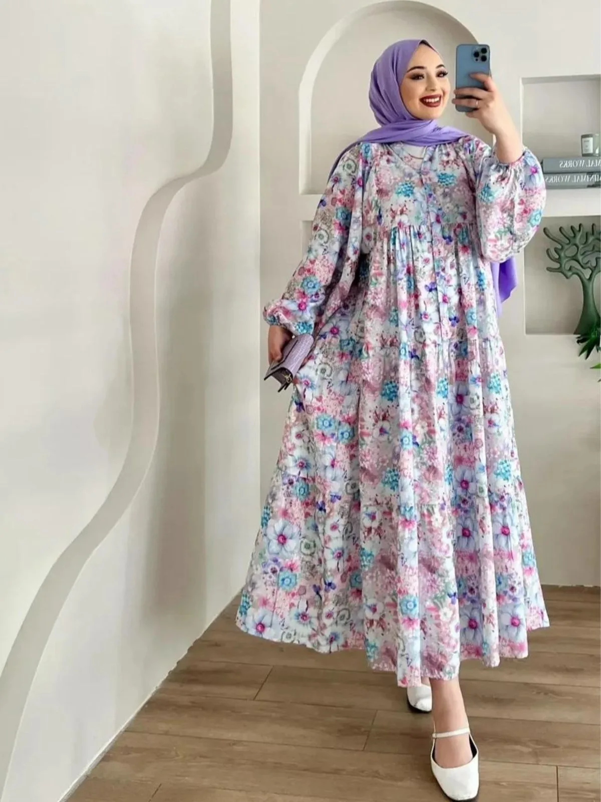 Pastel tonların romantik uyumuyla tasarlanmış bu çiçek desenli elbise, yaz aylarının enerjisini ve zarafetini bir arada sunuyor. Lila, pembe ve mavi tonların yumuşak geçişleri, feminen bir görünüm kazandırırken rahat kesimiyle gün boyu konfor sağlıyor. Hafif kumaşı sayesinde sıcak havalarda serin tutar ve günlük kombinlerden özel davetlere kadar çok yönlü bir kullanım imkânı sunar. Lila tonlarındaki şal detayıyla da kusursuz bir uyum yakalıyor.