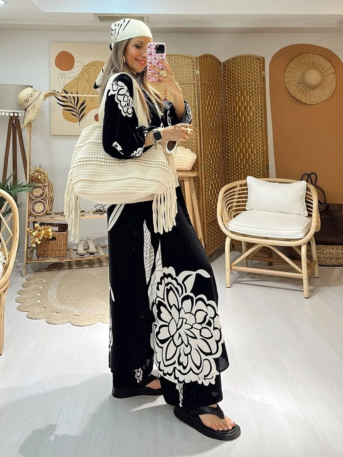 Gardırobunuza tek hamlede modern şıklık katacak bu ikili set; dökümlü, uzun gömlek‑kimono ve geniş paça pantolondan oluşur. Kremsi fona işlenen kontrast siyah tropik çiçek motifleri, minimal renk paletiyle maksimum etki yaratır.