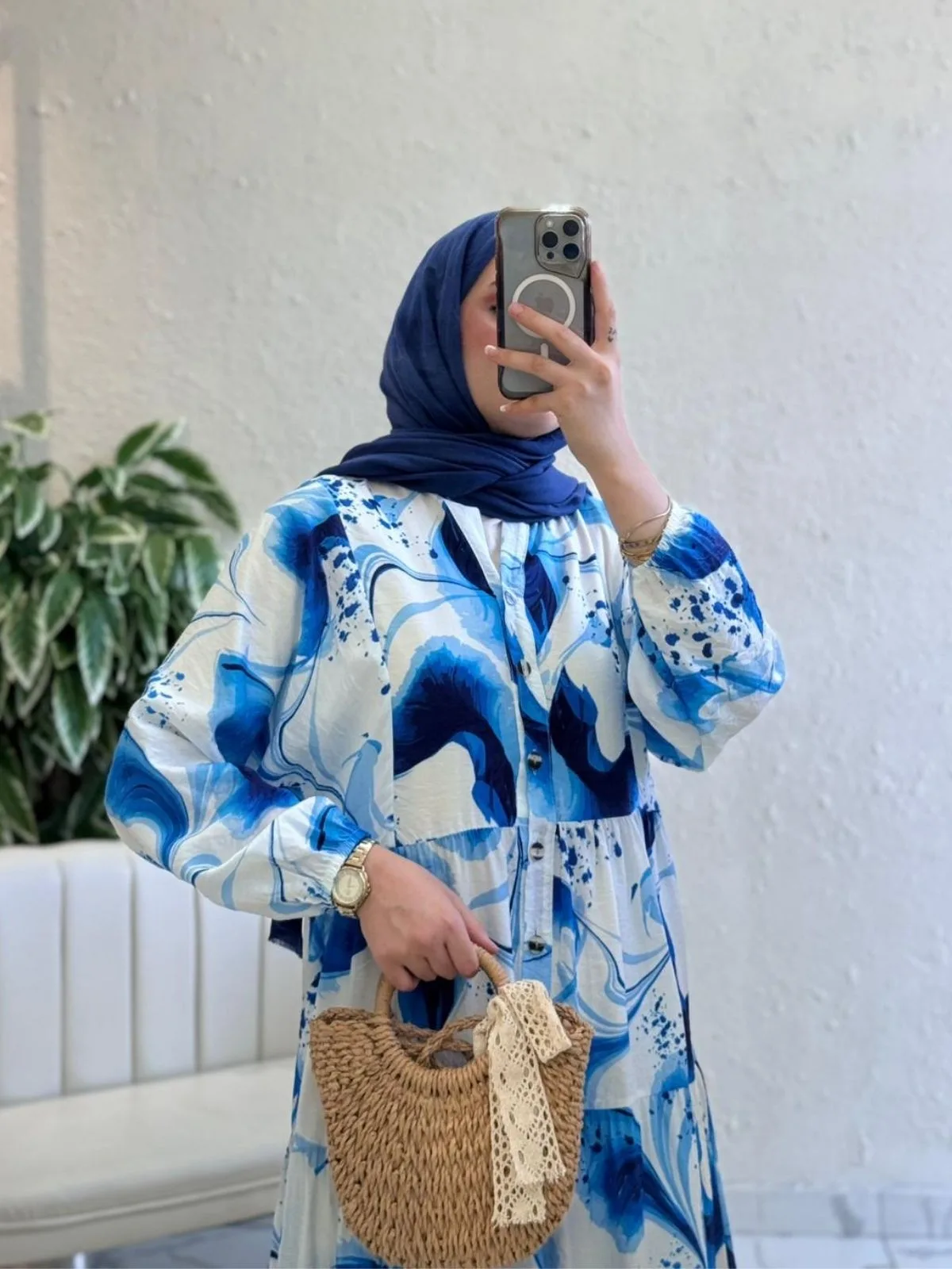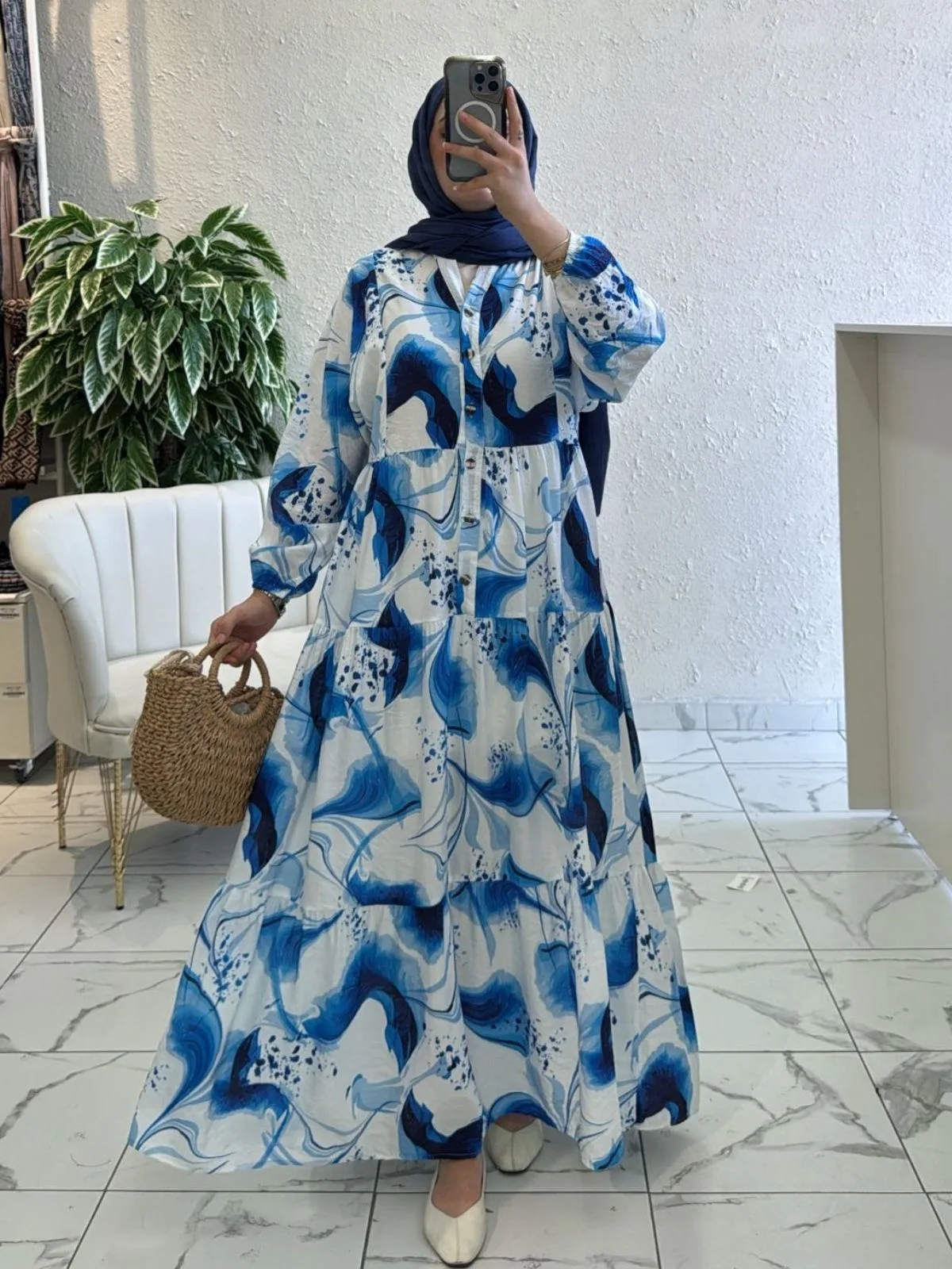 Okyanus dalga efektli mavi ton desenleriyle ferahlık veren kat kat maxi elbise. Hafif, nefes alır dokulu kumaşı ve rahat oversize kesimiyle yaz günlerinde serin ve konforlu; yarım düğmeli yuvarlak yaka hattı pratik giy‑çıkar sağlar. Bileğe doğru toplanan hacimli kollar ve geniş hareket alanı sunan kloş kat etek elbiseye akışkan bir siluet kazandırır. Günlük şehir stili, sahil gezileri ve yaz davetleri için kolayca şal/aksesuarla kombinlenir.