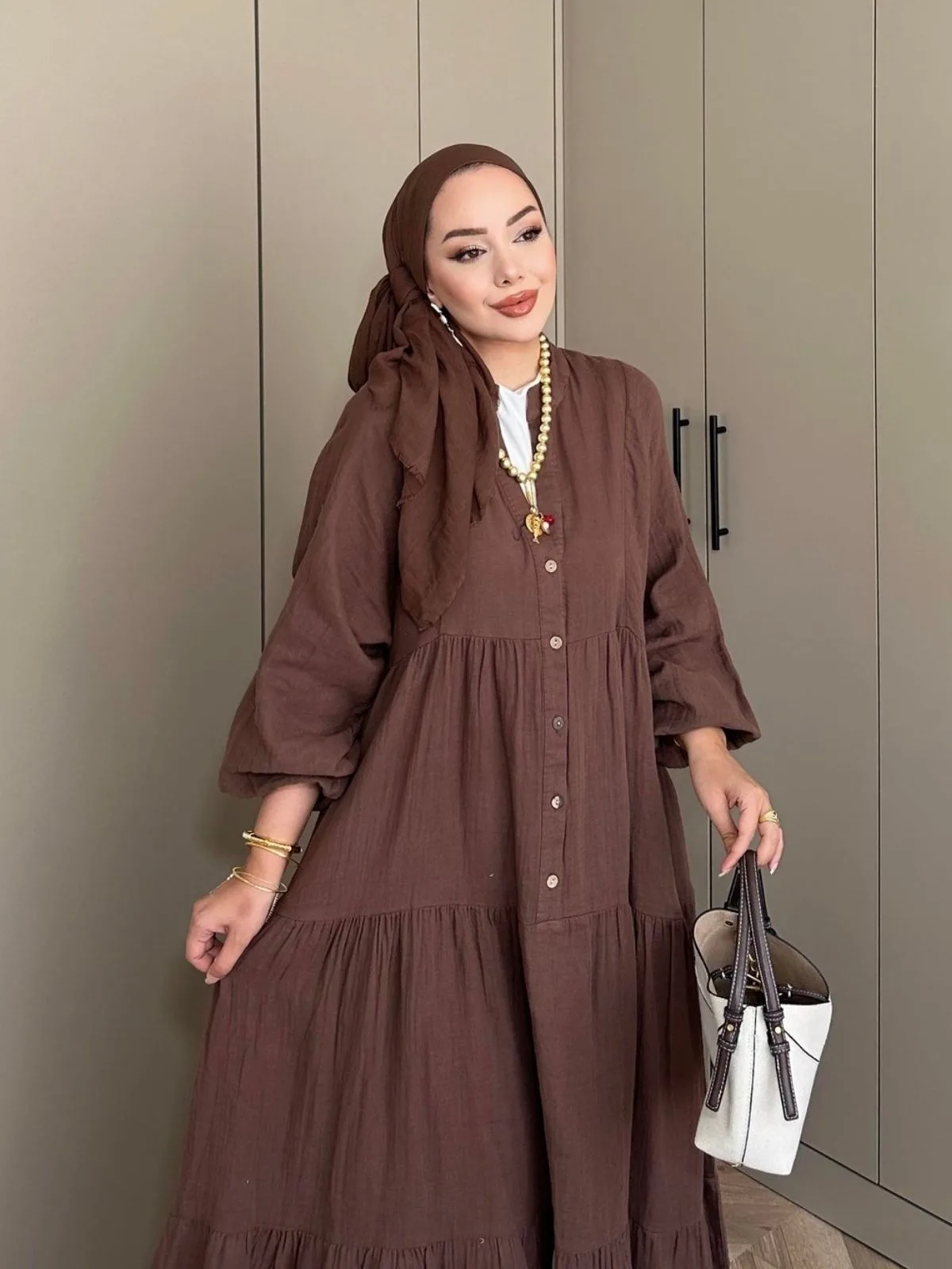 Pamuklu müslinin nefes alan hafifliği ile ketenin doğal dokusunu bir araya getiren , yaz günlerine layık tatlı bir serinlik sunar. Hareket ettikçe dalgalanarak güneş ışığını elbisenizin her kıvrımında yakalar.