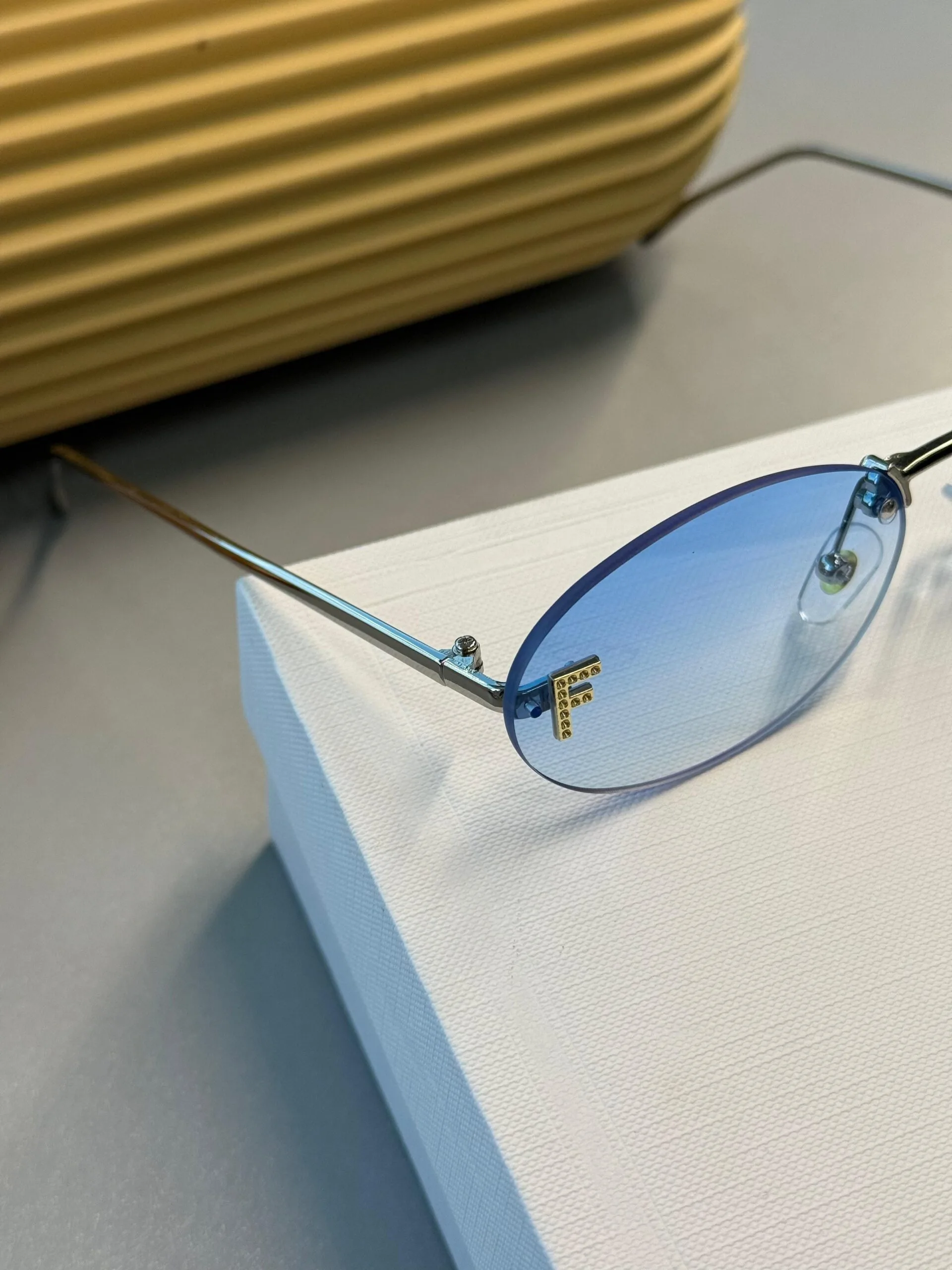 Mavi gradyan lensleri, göz alıcı kristal “F” logosuyla zarifçe taçlandırılan bu rimless model; minimal tasarımı lüks ayrıntılarla buluşturarak modern şehir ruhunu yansıtıyor. Altın tonlu paslanmaz çelik köprü, çerçevesiz oval siluete hafiflik ve incelik katarken, koyu kestane asetat saplar ergonomik kavisleri sayesinde gün boyu konfor sunar.