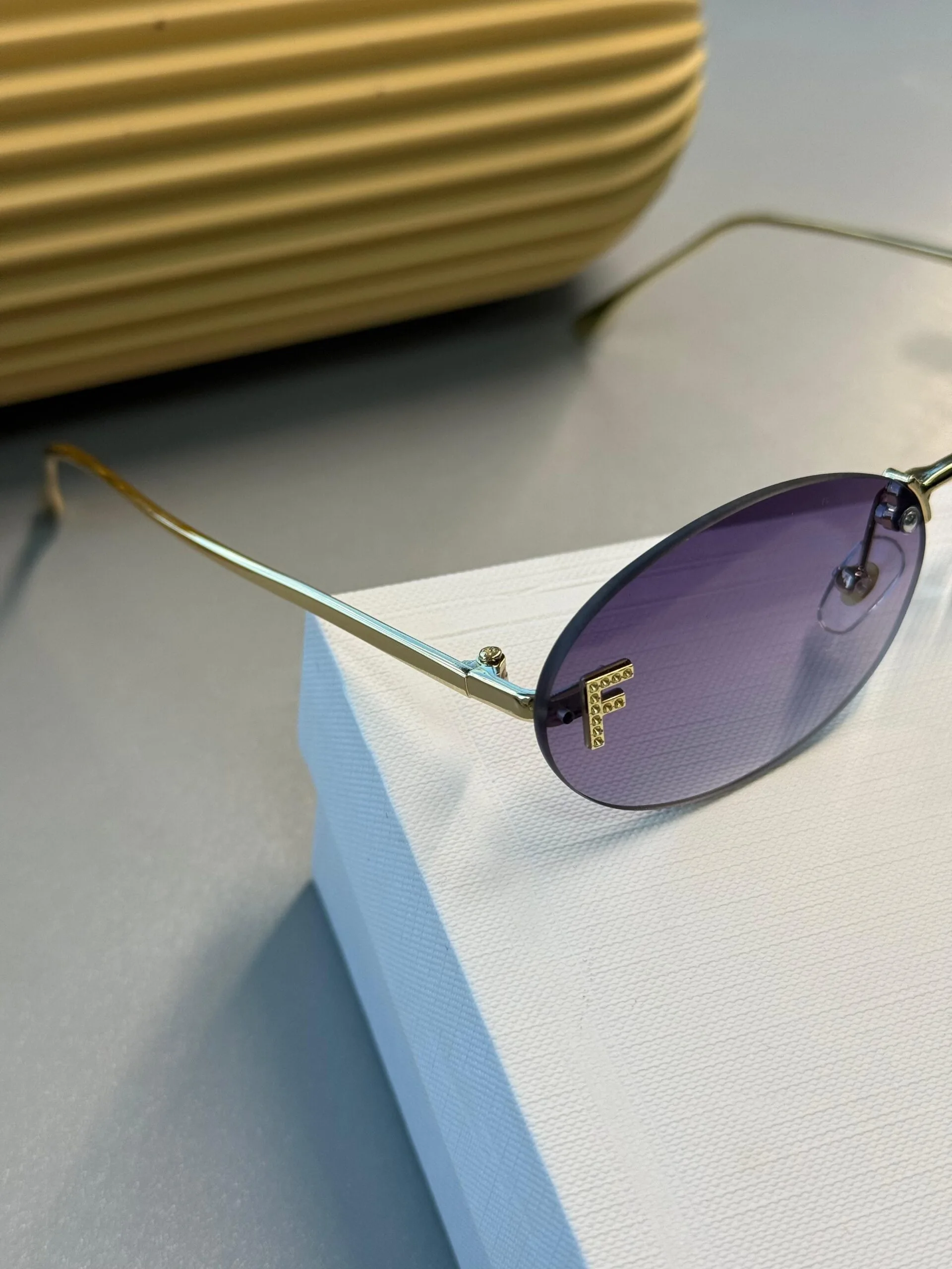 Mor gradyan lensleri, göz alıcı kristal “F” logosuyla zarifçe taçlandırılan bu rimless model; minimal tasarımı lüks ayrıntılarla buluşturarak modern şehir ruhunu yansıtıyor. Altın tonlu paslanmaz çelik köprü, çerçevesiz oval siluete hafiflik ve incelik katarken, koyu kestane asetat saplar ergonomik kavisleri sayesinde gün boyu konfor sunar.