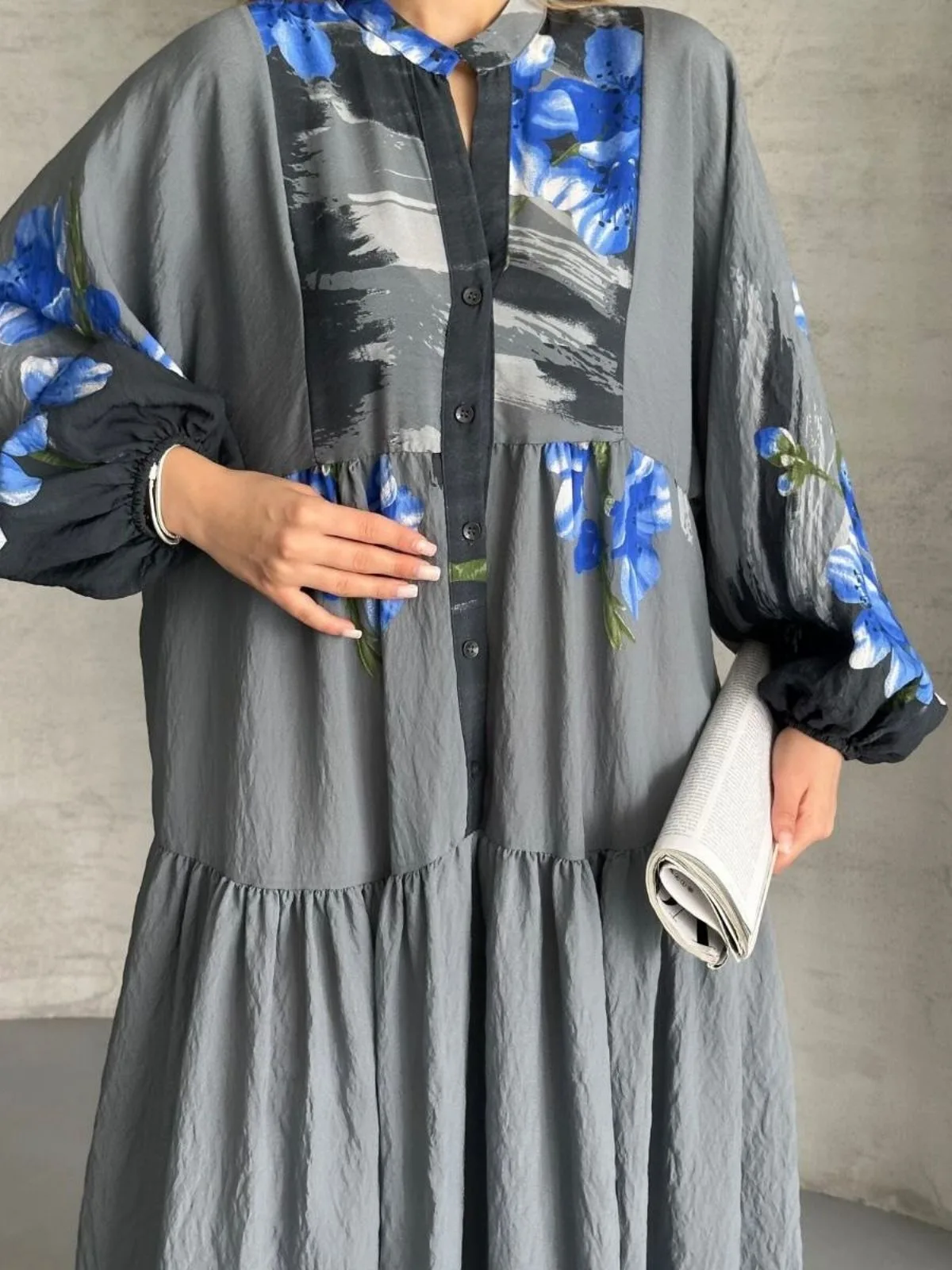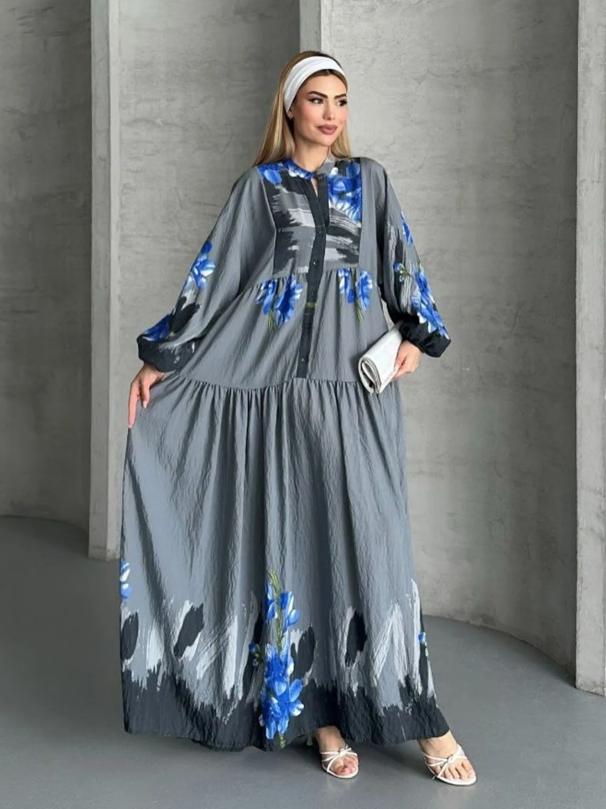Bu elbise, modern ve zarif detaylarıyla dikkat çeken oversize bir tasarıma sahip. Üst kısmında yer alan mavi çiçek desenleri ve fırça darbelerini andıran gri-siyah geçişleriyle sanatsal bir görünüm sunuyor. Rahat kesimi ve düşük omuzlu uzun kolları, günlük kullanımda konfor sağlarken aynı zamanda özel davetlerde de şık bir tercih olabiliyor. Hafif dokulu kumaşı hem nefes alabilirlik hem de hareket kolaylığı sunuyor. Minimal aksesuarlarla kombinlenerek zarif bir stil elde edilebilir.