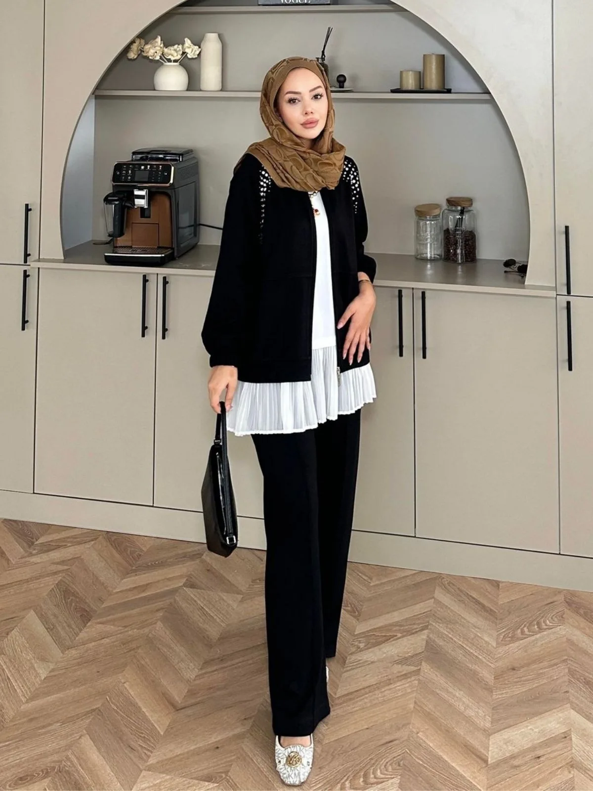 Hem günlük şıklıkta hem özel davetlerde rahatlıkla tercih edilebilecek bu takım, modern zarafeti geleneksel dokunuşlarla buluşturuyor.