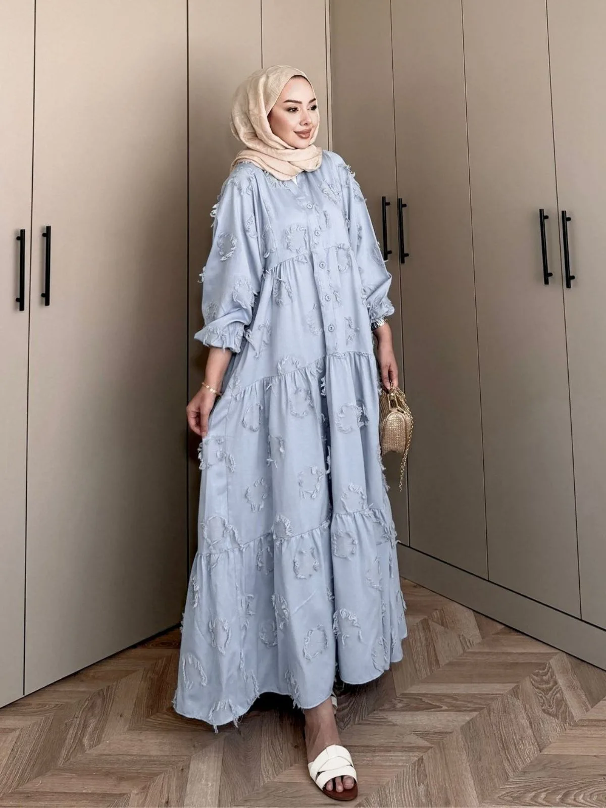 Mavi tonundaki zemin üzerine işlenmiş kabartmalı dokularla hareket kazanan Saf Mavi Rüya  Dokunuş, zarif ve minimal bir görünüm sunuyor. Yaz aylarının ferah hissini yansıtan bu ton, hem günlük kombinlerde hem de özel günlerde şık ve sade bir alternatif olarak öne çıkıyor.