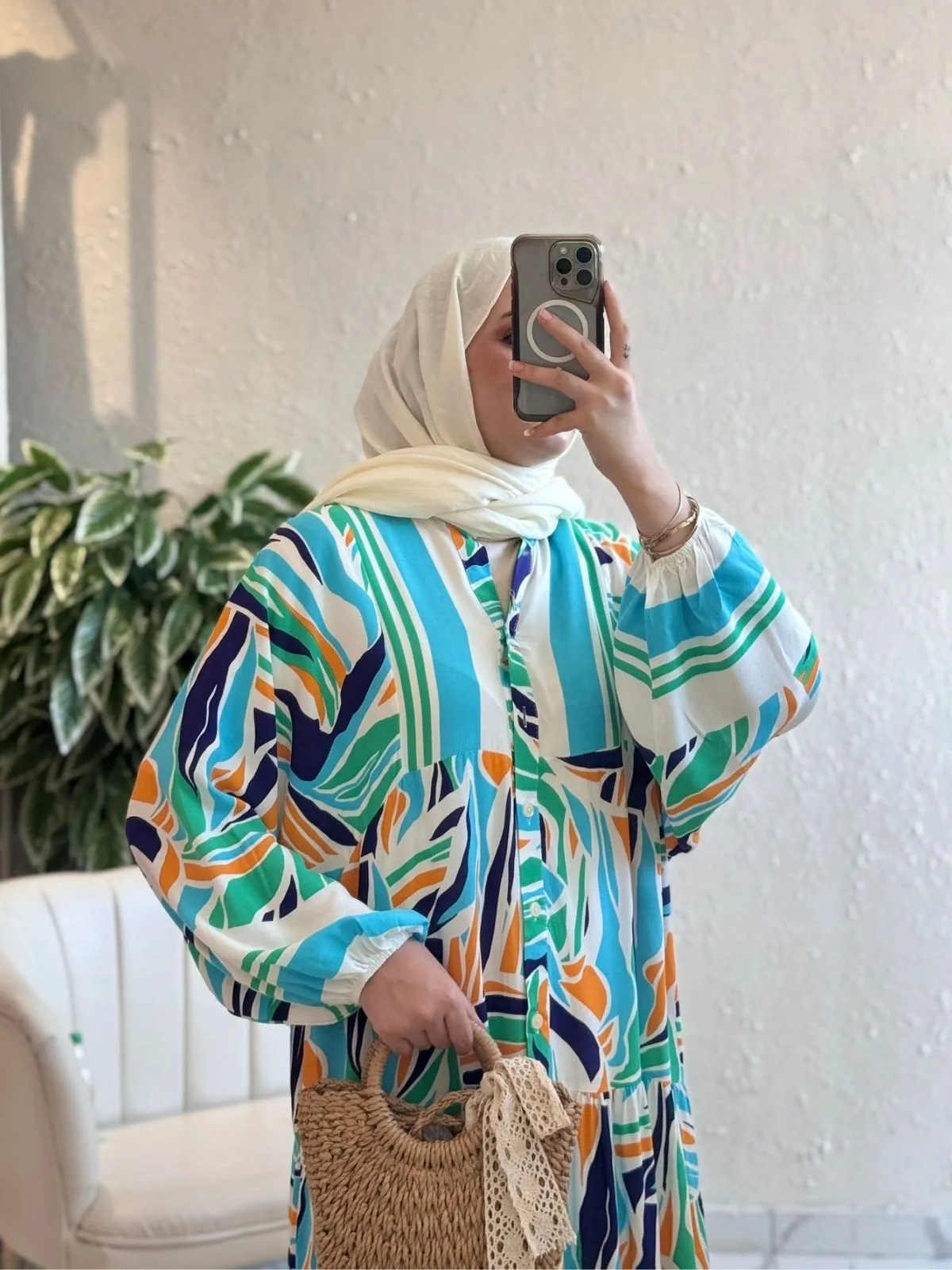 Bahçe yosunu yeşili, kum beji ve bulut beyazı lekelerin arasından geçen deniz mavisi akıntılar lacivert  konturlarla belirginleşiyor; grafiti fırça darbeli desen elbiseye modern sahil enerjisi katıyor. Rahat oversize kalıp, kontrast siyah patlı/V yaka hattı ve bilekte lastikli balon kollarla hem ferah hem iddialı. Kat kat dökümlü etek her adımda dalga gibi hareket eder; nötr şallar ve hasır çantalarla tamamlandığında şehirden kıyı tatiline tek adımda geçeceğiniz bir görünüm sunar.