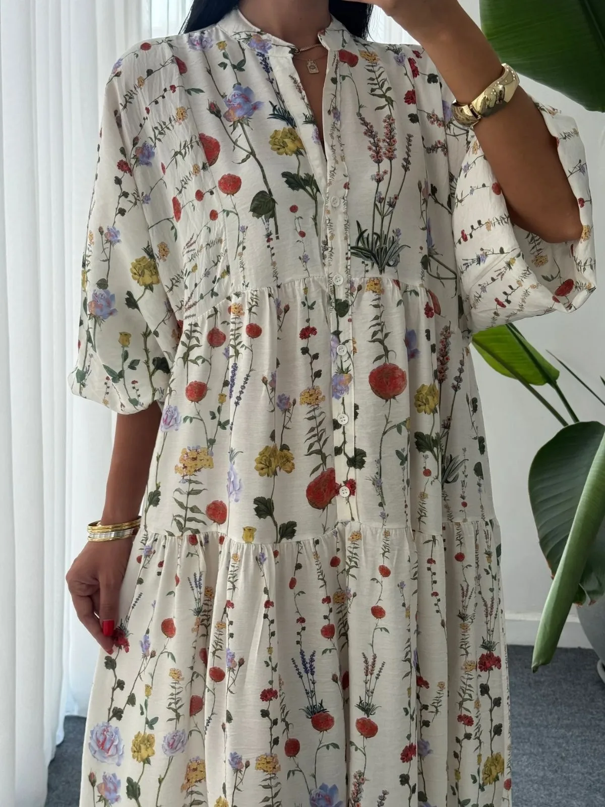 Doğal tonların zarafetiyle öne çıkan bu uzun elbise, çiçek desenleriyle romantik bir bahar esintisi sunuyor. Hafif ve dökümlü kumaşı, gün boyu rahatlık sağlarken aynı zamanda şık bir görünüm kazandırıyor. Geniş kesimi sayesinde ferah bir kullanım sunan bu elbise, hem günlük şıklık hem de özel gün kombinleri için ideal bir tercih. Sandalet ya da espadril gibi ayakkabılarla tamamlandığında yaz ruhunu yansıtırken, zarif aksesuarlarla daha elegan bir stil oluşturabilirsiniz.
