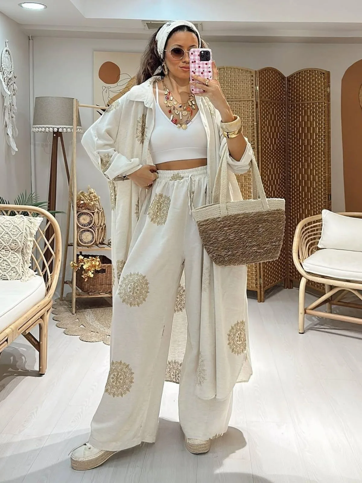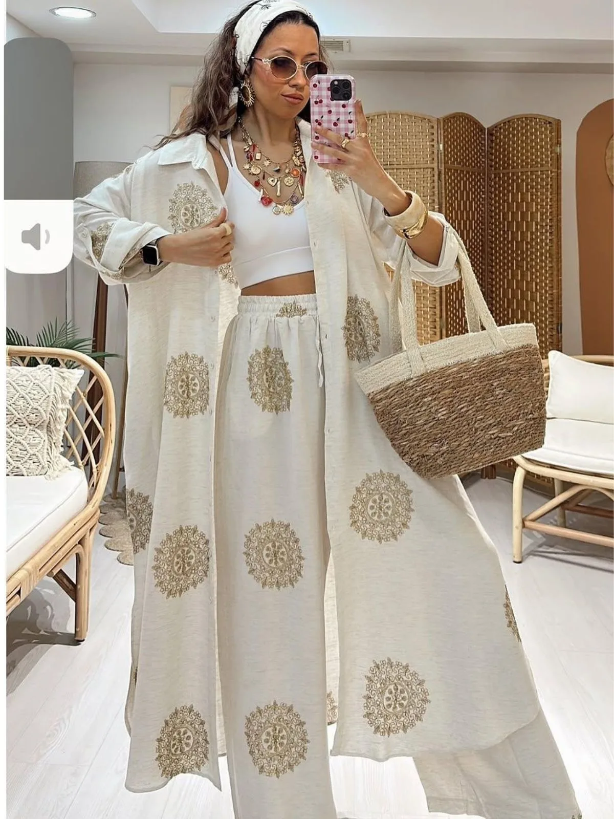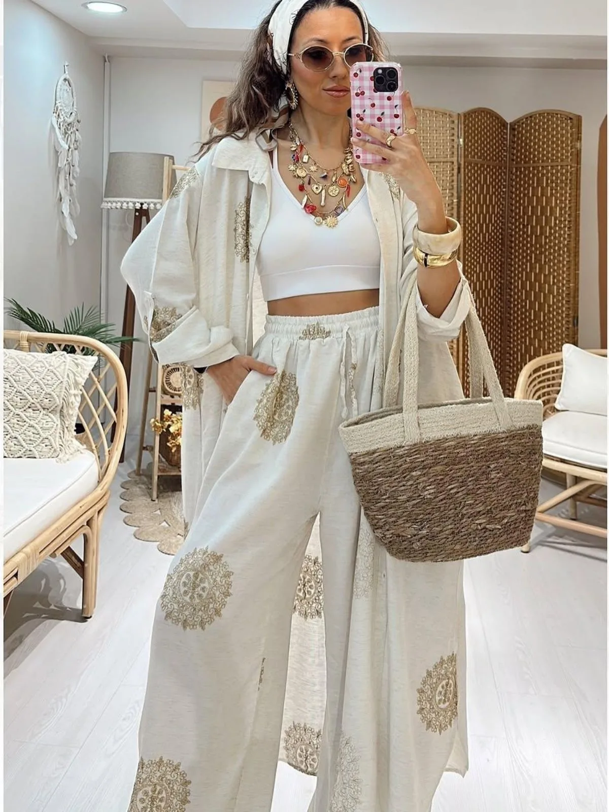 Yazın serin akşamlarına ve tatil kaçamaklarına eşlik edecek rahat–şıklık: dökümlü oversize gömlek/kimonosu ve bol paça lastikli beliyle ultra konforlu pantolondan oluşan iki parçalı takım. Doğal görünümlü hafif kumaş üzerine yerleştirilen yumuşak altın tonlu mandala baskılar bohem bir zarafet katıyor. Uzun boylu üst parça ister açık kimono, ister düğmeli gömlek olarak kullanılabilir; crop top, mayo ya da basic tişörtlerle kolayca kombinlenir. Plaj çantası, hasır aksesuarlar ve katmanlı takılarla tamamlayarak effortless resort stilini yakalayın.