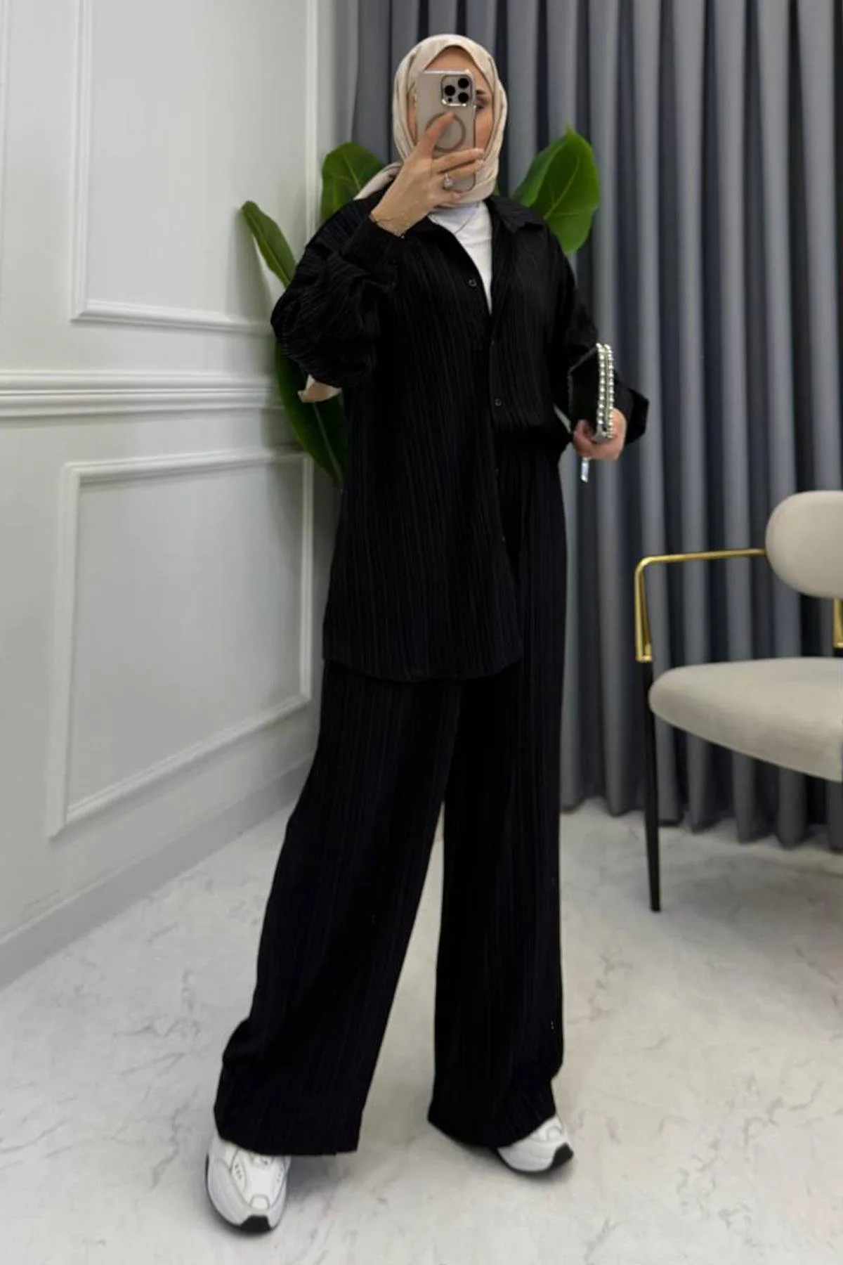 Nora Düğmeli Keten Takım TK10046 – Siyah