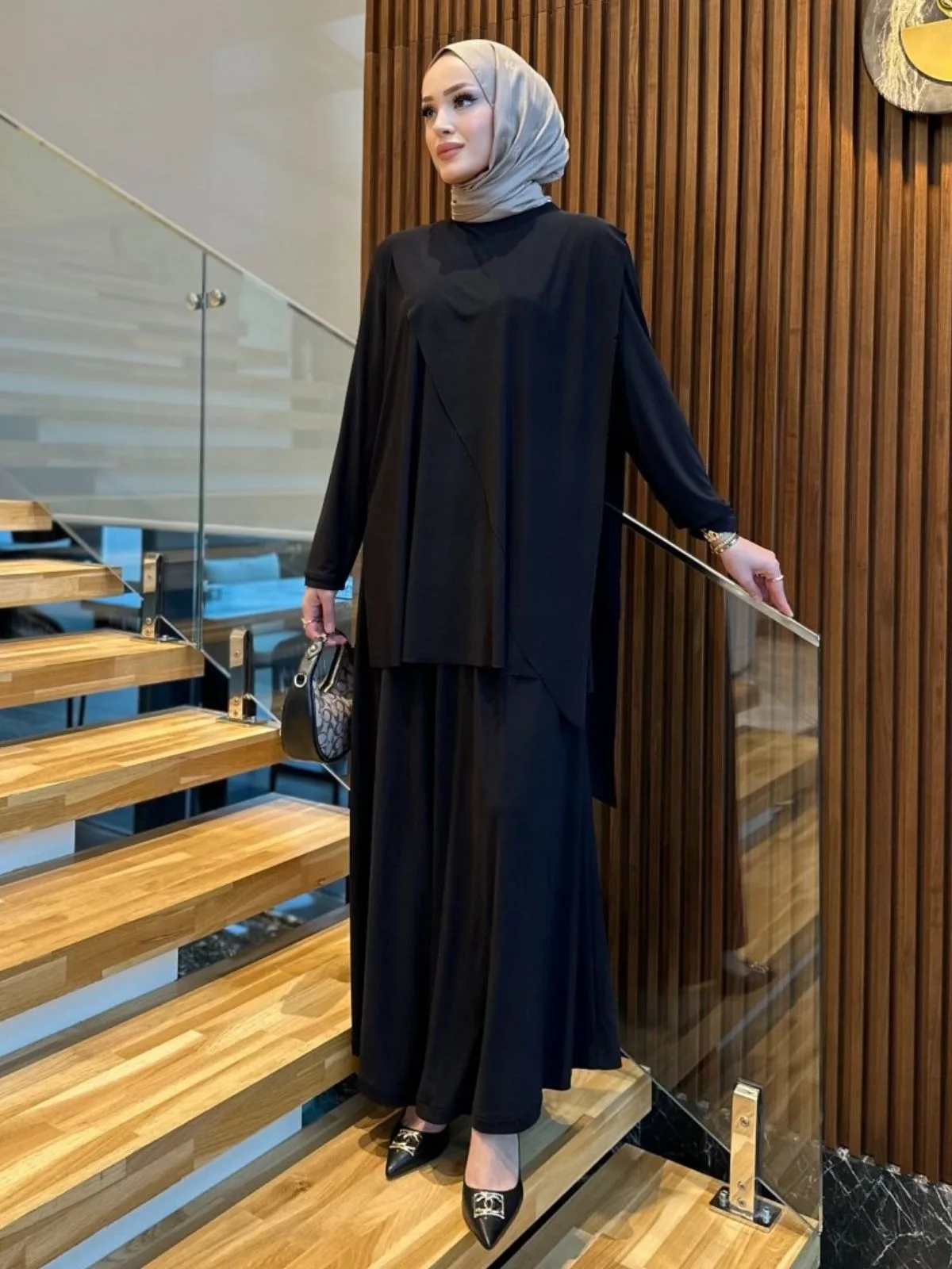 Hem günlük şıklıkta hem özel davetlerde rahatlıkla tercih edilebilecek bu takım, modern zarafeti geleneksel dokunuşlarla buluşturuyor.